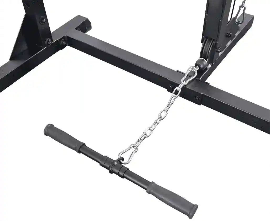 Nylon-coated, aircraft quality cables ensure durability and safety even during heavy use. Includes a lat bar and low row bar and is ready for a multitude of other attachments.