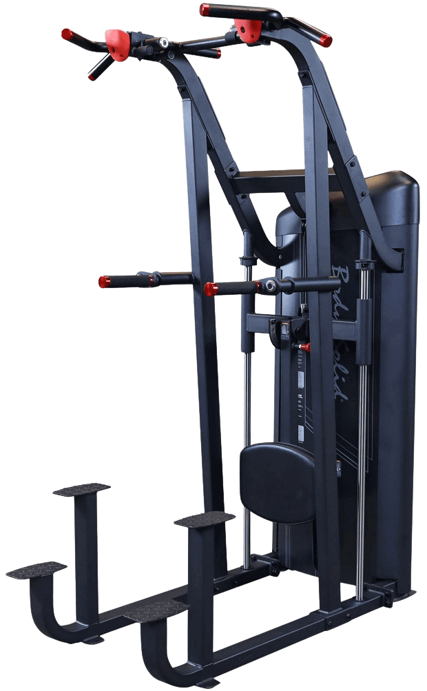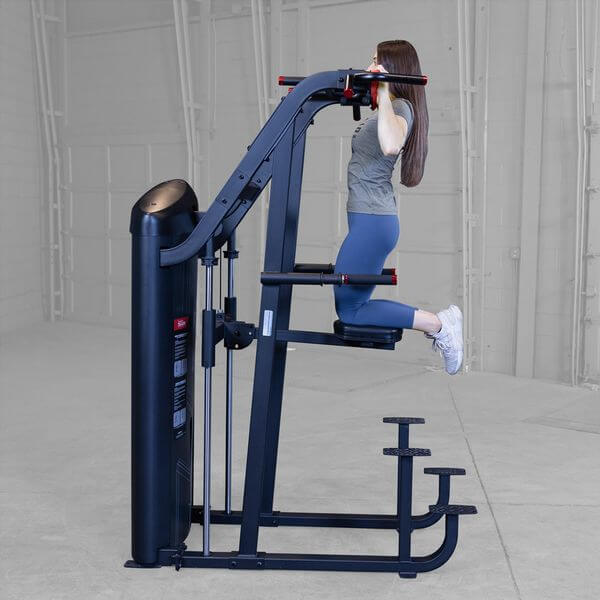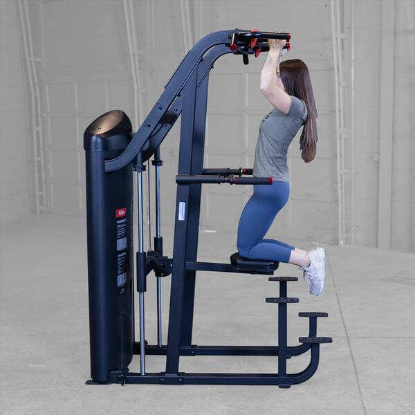 Body-Solid’s Weight-Assisted Chin Dip Machine allows users to perform dip, chin-up and pull-up movements more easily and effectively by counterbalancing the user’s bodyweight. The S2ACD is available with a 235lb weight stack. This counterbalanced weight allows for full range of motion, perfect repetitions and proper form regardless of the user's current fitness level. The S2ACD features two wide lat pull-up grips, both neutral and traditional for exercise variety. The unique close grip chin up bar folds out of the way for the other exercises and also features both a neutral and traditional hand grip positions.