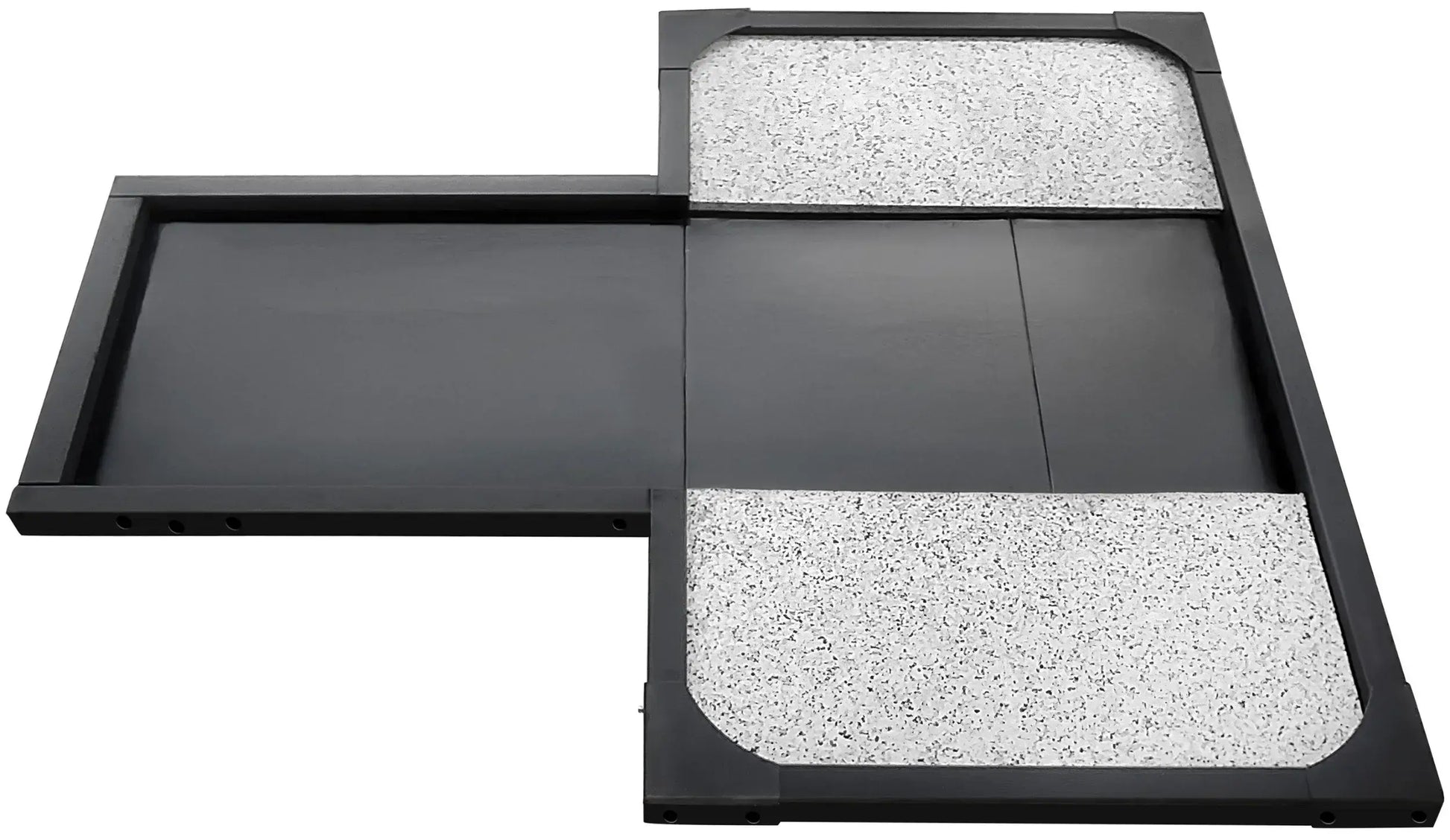 The French Fitness Weightlifting Deadlift Platform, boasts a comprehensive design to maximize safety and performance. With a footprint of 94" x 108.5", this platform offers ample space for athletes to maneuver and execute their lifts effectively. At its core lies the center platform, measuring 41" x 60", providing a sturdy foundation for lifting. Flanking the center are the drop zones, each spanning 26" x 60", furnished with impact-absorbing rubber to shield both equipment and platform from damage and minimize noise. Seamlessly integrated into the layout is the rack area, sized at 41 x 48.5" ensuring stability for the half rack. This meticulously crafted configuration guarantees a safe and conducive environment for weightlifting, making it an indispensable asset in any gym or training facility.