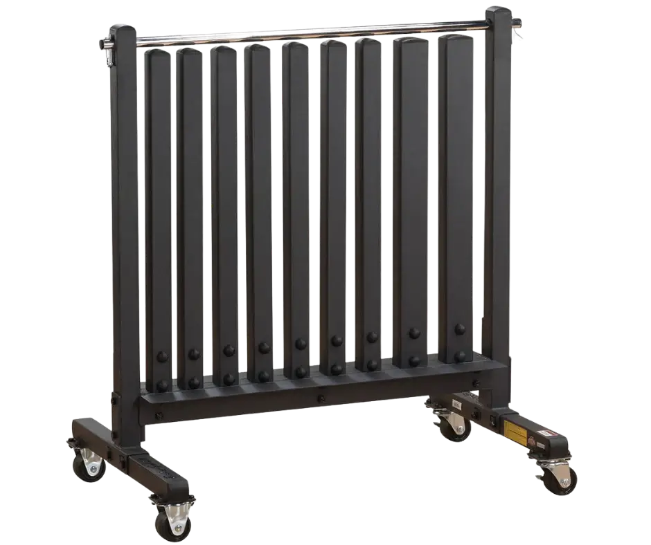 With a compact footprint of 26.5" L x 42.5" W x 46" H, Dumbbell Rack. It stores all weights in a minimal amount of space. Built from heavy-gauge steel oval tubing, the rack offers outstanding stability and durability. Heavy-duty casters allow for smooth and effortless mobility. This space-saving, transportable rack is the ideal companion for storing the full range of colorful, easy-to-clean vinyl dumbbells.