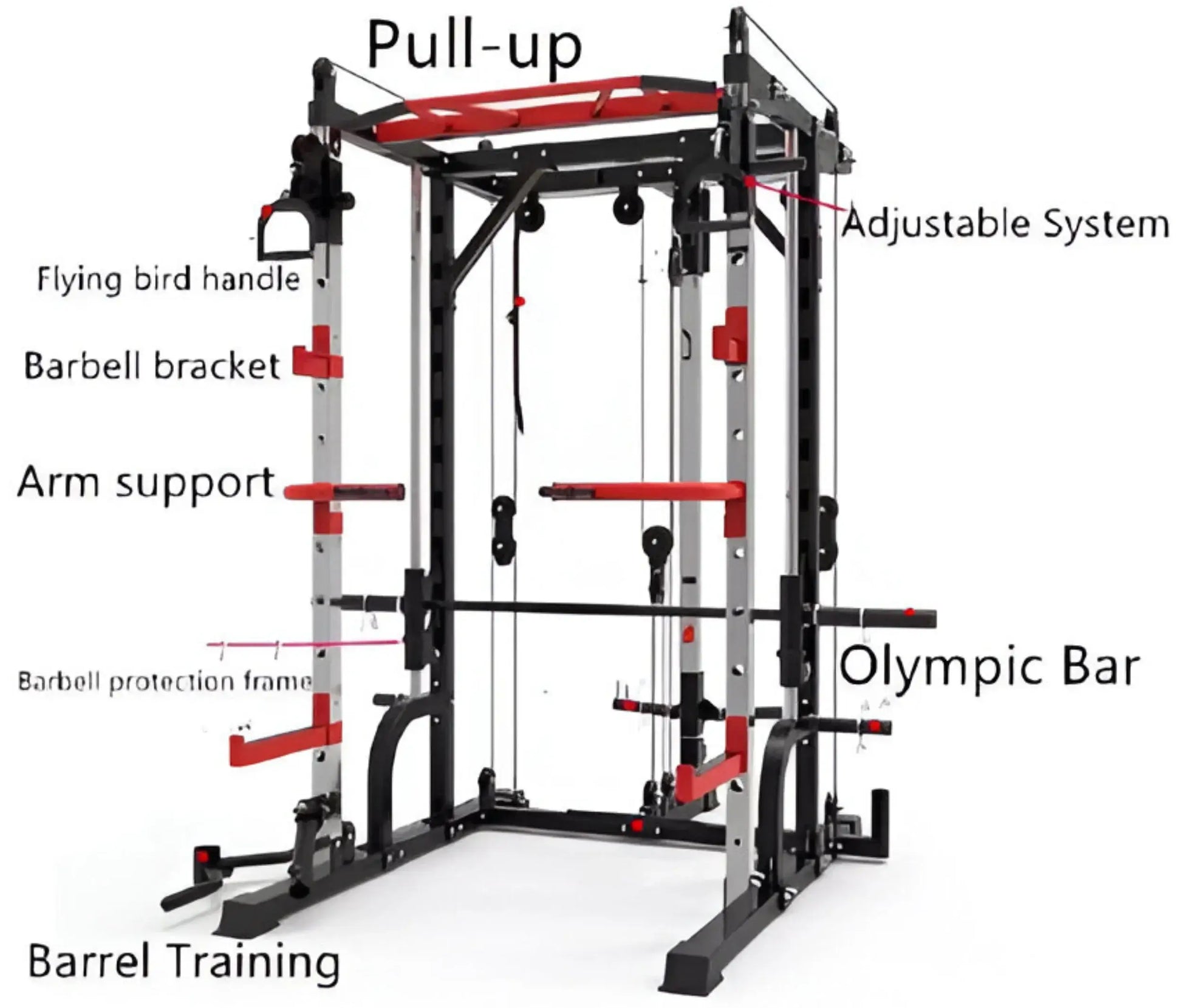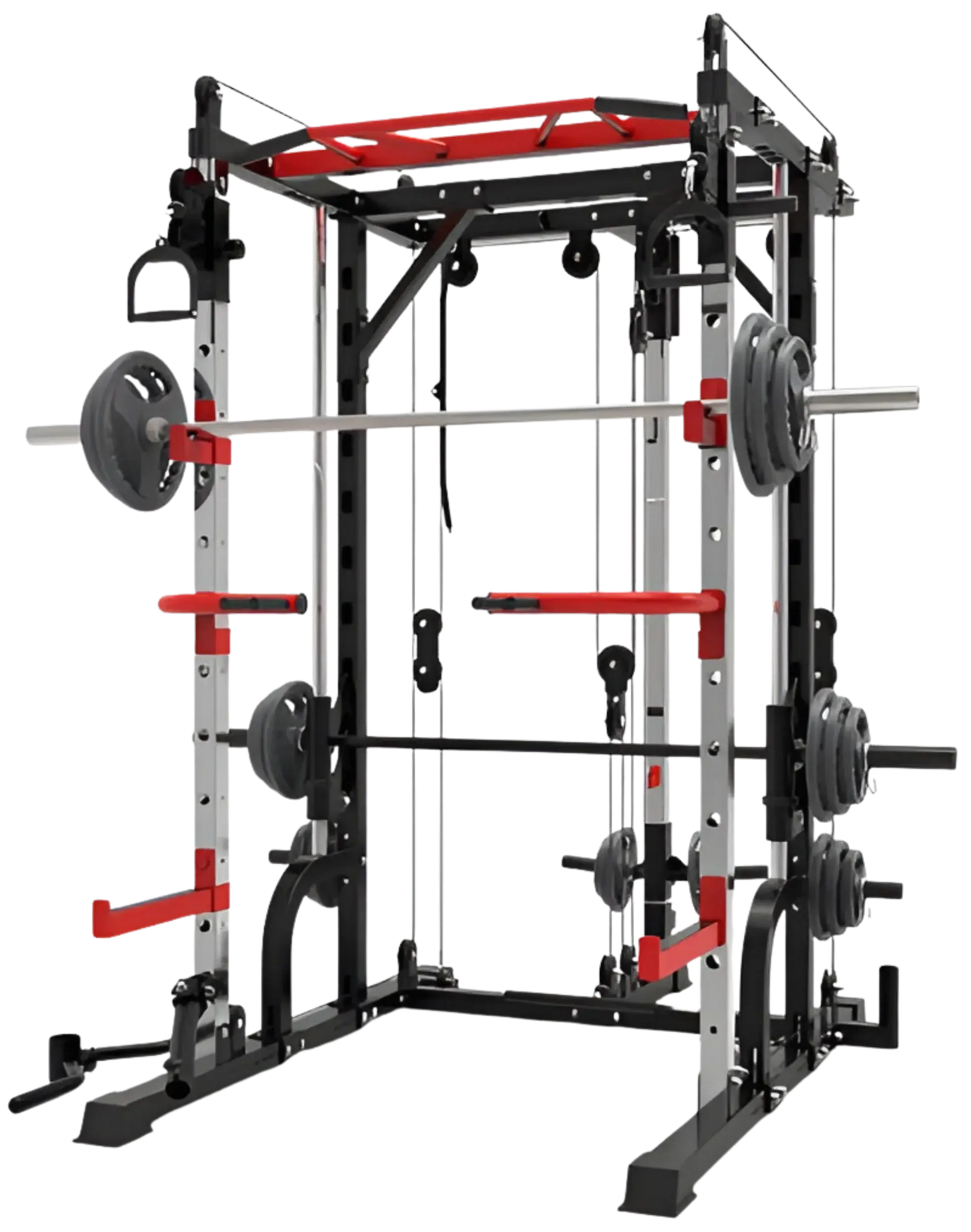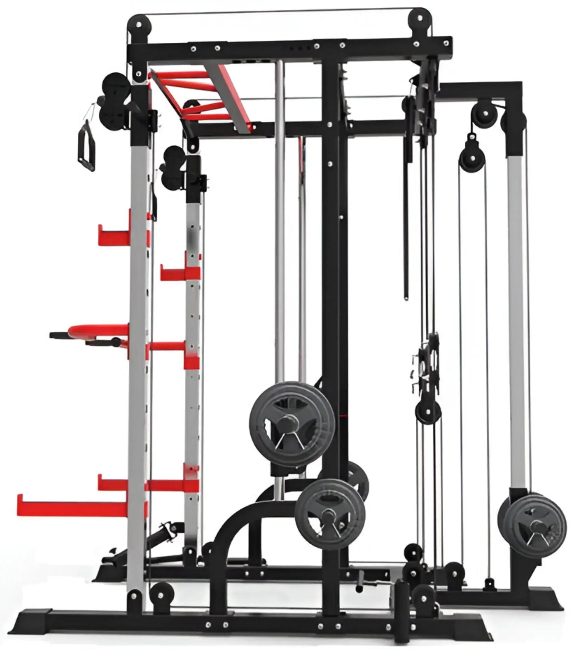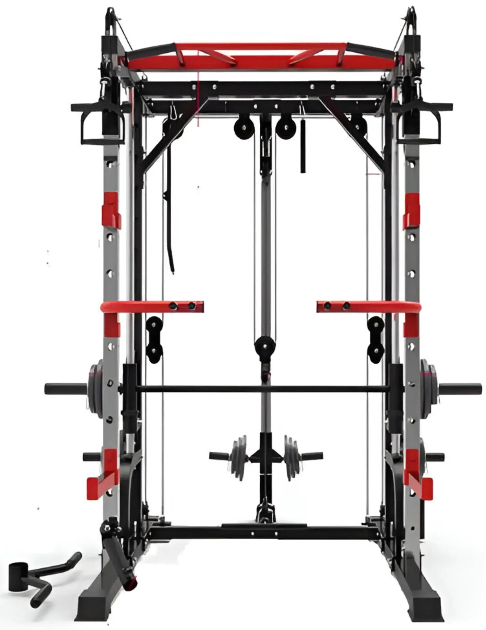 The French Fitness FSR10 Multi Cable Functional Smith Rack Machine is the ultimate all in one trainer. It has combined a functional trainer with a counter-balanced commercial smith barbell added a squat rack with spotter arms and designed a clever pulley system all in one compact amazing machine.
