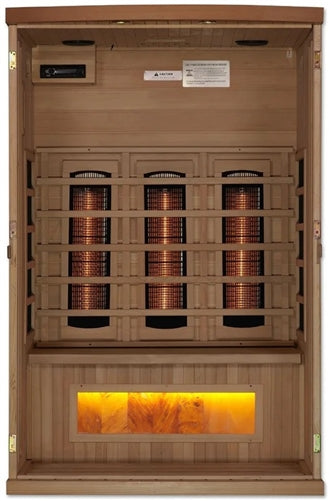 GoldenDesigns GDI-8020-02 2-Person Full Spectrum PureTech Near Zero EMF FAR Infrared Sauna with Himalayan Salt Bar, the Carbon Tech heating panels are engineered to produce a wider, softer heat that is evenly distributed throughout the sauna. Golden Designs Carbon Tech heating panels cover a significantly larger surface within the sauna. Sauna Use: Indoor Only |