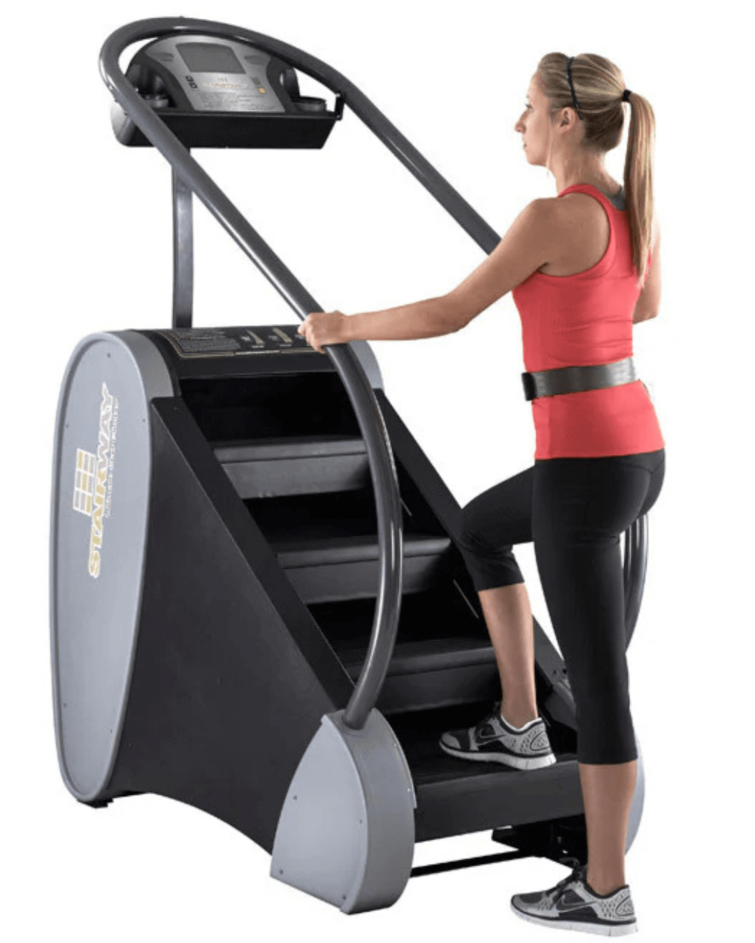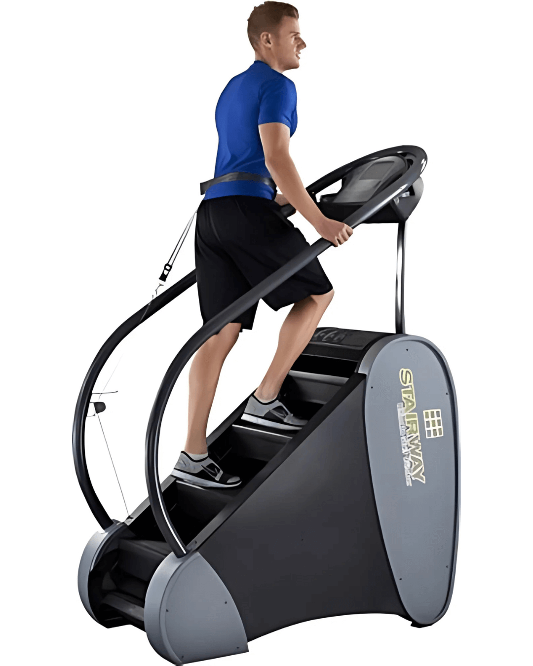 The Jacobs Ladder Stairway is a stair climbing Cardio machine designed specifically for the commercial environment. The unique design offers a rotating staircase where the speed of the stairs is controlled by the tension of the waist belt (Which is identical to Jacobs Ladder). The higher you go, the faster the stairs come, so you are always in control of your speed. The unit is self-powered so there is no need for a wall plug. The ceiling height requirement is 8.5 feet and the width is 30.5", so you can place it in areas where most stair climbers won't fit. The display gives Stairs Climbed, Rate, Elapsed Time, Calorie Burn, and Heart Rate (with wireless strap). The initial step height of 11" is among the lowest on the market. The Stairway is the ultimate stair climber!